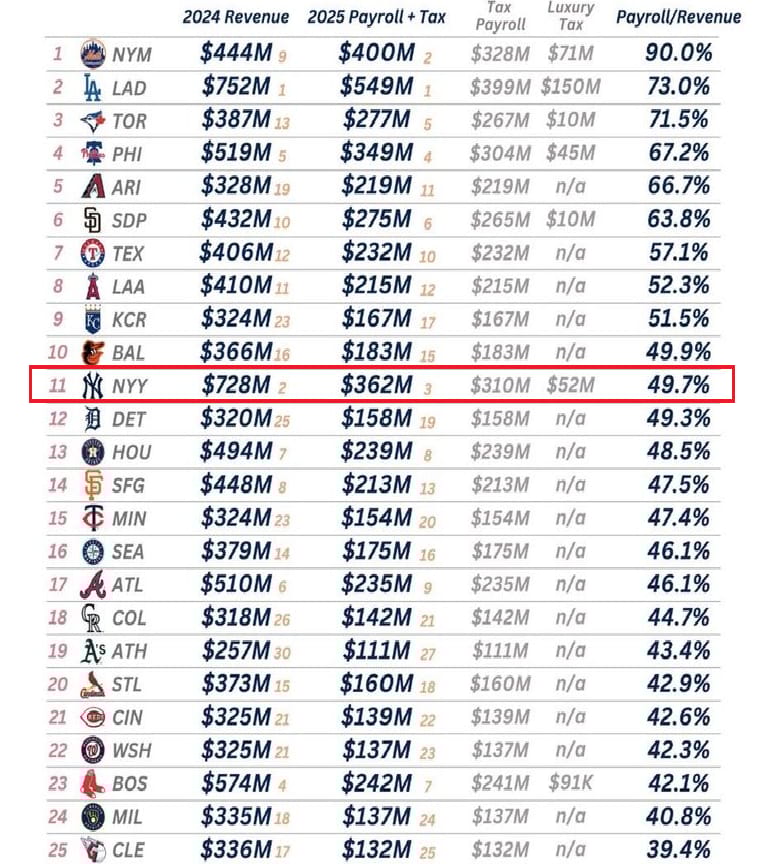 One-third of the league is investing a bigger percentage of revenues into payroll. Wouldn’t that suggest the Yankees should be able to spend even more (ignoring the CBT thresholds and penalties, for a moment)?